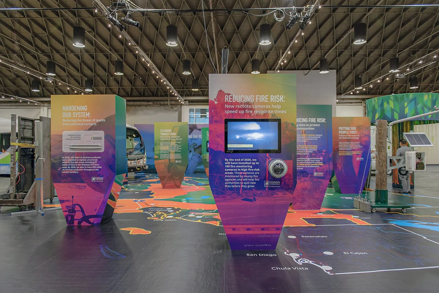 The entrance to the exhibit unveiled an event space lined with a large floor decal of an illustrated map of SCE’s California service territory. Marking the high fire risk areas of the map were large pin-shaped structures that highlighted the concrete steps being taken to mitigate fire risks. Among those efforts were new technologies featured through interactive touch displays where guests could see live iterations of the tech and learn more virtually.