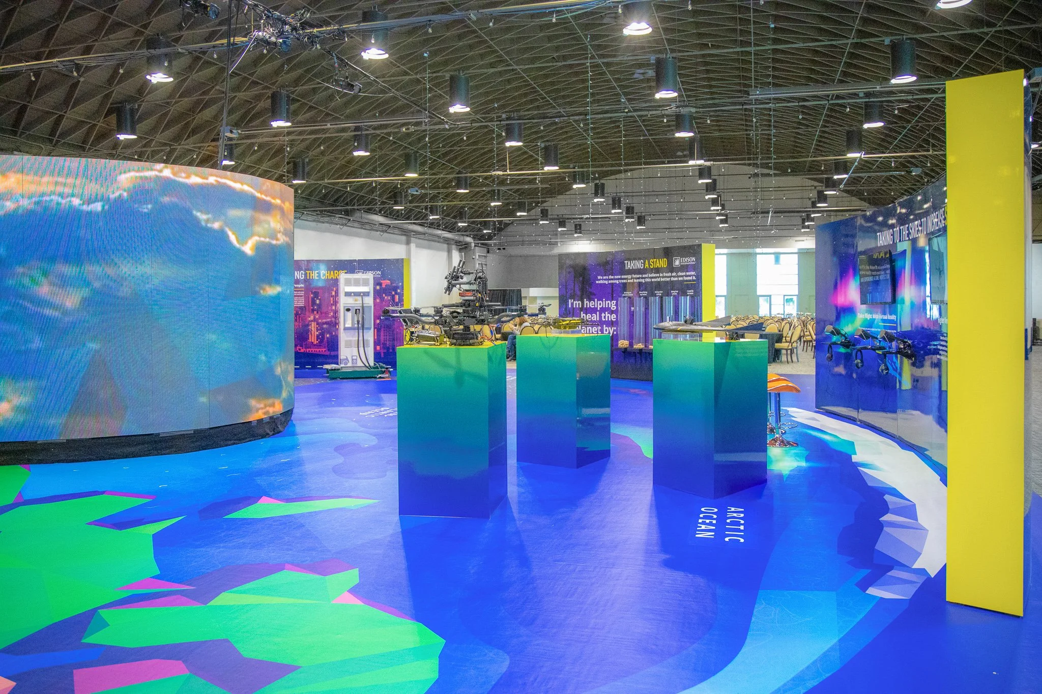 It is important to note that local efforts for a clean energy future could be felt worldwide, for this reason the entirety of the exhibit floorspace was overlayed with a vinyl wrap to show a world split by day and night. The entrance to the exhibit was encased by two large walls and a graphic floor, creating a tunnel effect designed to make visitors start their journey passing through a glacier in Antartica. Directly ahead was a 360-degree circular display, visually representing the wind currents and displaying animated text portions of the letter from the future in a constant loop. Placed around the radius were several structural displays, creating dedicated informational and experiential spaces for high-profile initiatives. These initiatives included a virtual reality ride aboard a drone, a high efficiency induction cooktop kitchen with live cooking demos, and an electric vehicle hub including a rapid car charger on display.