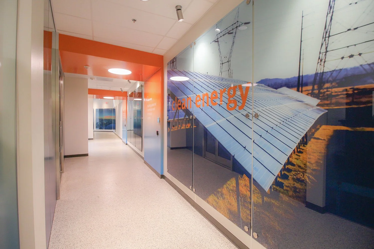 Originally a blank slate, this facility houses the latest technology and innovation under consideration for enterprise use. The brief of this project was to introduce and reiterate the importance of continuous improvement and advancements in technology to better serve the community with reliable, safe and cost-effective solutions. Visits by high profile stakeholders meant that the best opportunity was to engage visitors along the long corridors that lead to individual dedicated labs. Large-scale original photography, high impact messaging and mix use of materials and transparencies added visual interest that invited visitors to pause, absorb and be led onto the next zone. Privacy and security were conserved and enhanced through unique signage design, acoustic paneling placement and window film installations.